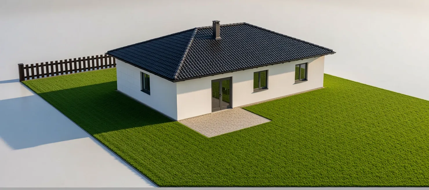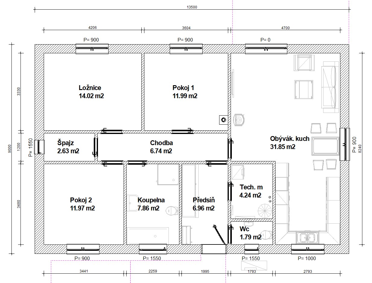Rozměry domuDélka 13,5 m, šířka 9 m