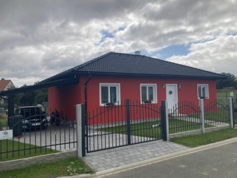 Tento krásný domek jsme předali našim zákazníkům do užívání v roce 2020. S dodělaným kovovým plotem a přístřeškem pro auto vypadá majestátně. Díky své barvě získal od sousedů přezdívku: ,,Hasičárna" 🙂